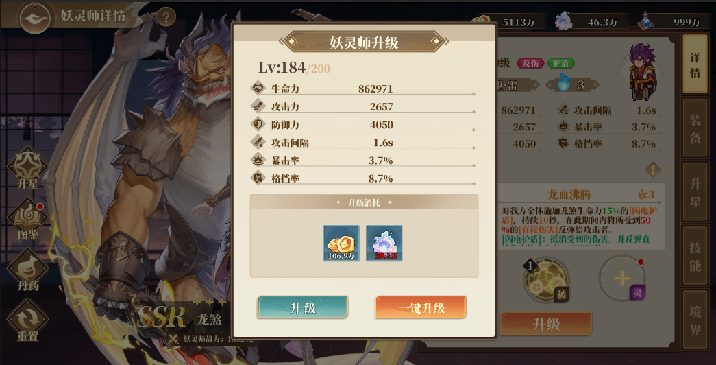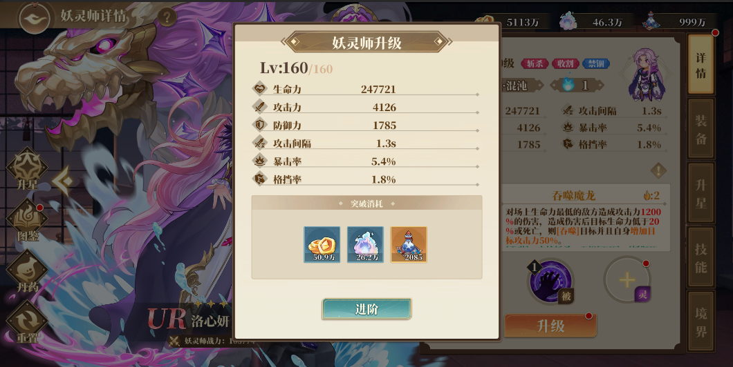 妖靈師可以通過(guò)消耗升級(jí)材料(妖晶幣、龍?jiān)`液)提升等級(jí),而升級(jí)可以提升面板屬性,當(dāng)達(dá)到等級(jí)上限時(shí)可以通過(guò)消耗妖晶幣、龍?jiān)`液和九轉(zhuǎn)丹進(jìn)階等級(jí)上限。不過(guò)前期資源有限,還是盡量避免將養(yǎng)成材料分散給太多角色,練好一隊(duì)主力隊(duì)伍能過(guò)主線才是最重要的。?