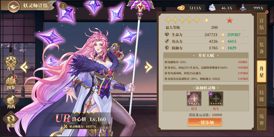 升星可以提高英雄的各項(xiàng)初始屬性,每次升星需要消耗不同條件升星材料,升星達(dá)到指定星級(jí)后還可額外解鎖該妖靈師獨(dú)有的升星天賦。已經(jīng)滿星或溢出的妖靈師可通過(guò)招募——遣散功能進(jìn)行遣散,再用獲得的時(shí)空殘卷到秘寶軒的兌換商店中兌換自己所需要的妖靈師。