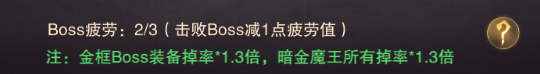 挑戰(zhàn)BOSS需要消耗BOSS疲勞,每天有3次的免費挑戰(zhàn)機(jī)會。隨著轉(zhuǎn)生等級的提高,可以挑戰(zhàn)的層數(shù)就越高,其中每層的黃金領(lǐng)主與暗金魔王裝備掉率是1.3倍,建議把次數(shù)都用于挑戰(zhàn)這兩個BOSS。