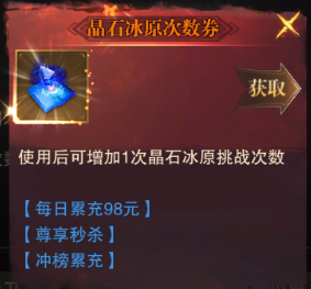 挑戰(zhàn)機(jī)會:成為SVIP后可以通過花費20泰坦幣來購買多1次挑戰(zhàn)機(jī)會。也可以使用晶石冰原次數(shù)券來增加挑戰(zhàn)次數(shù)。晶石冰原次數(shù)券獲得的途徑比較多,
